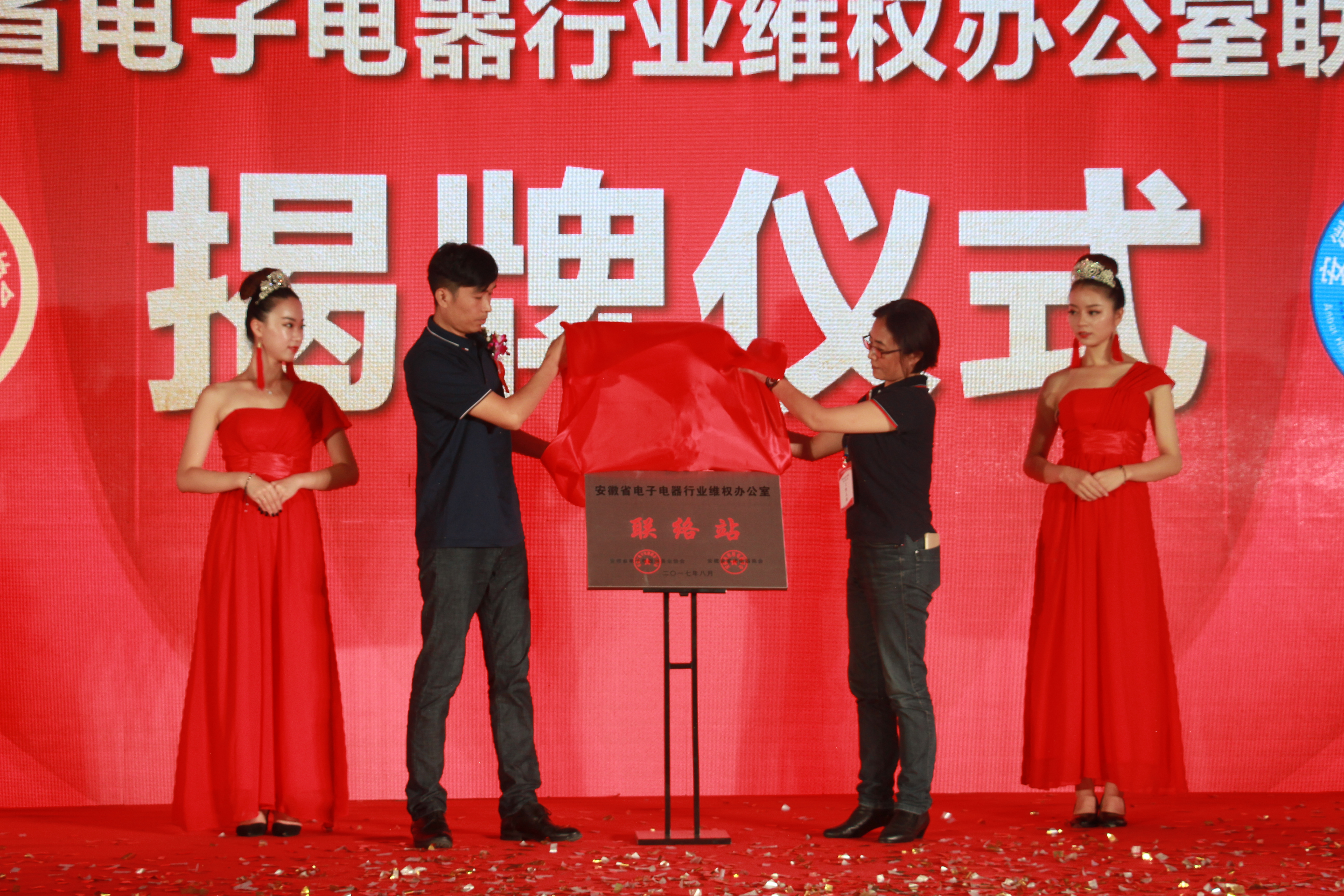 安徽省電子電器行業(yè)維權(quán)辦公室聯(lián)絡(luò)站由安徽省電子行業(yè)協(xié)會與安徽省家用電器商會共同成立,并于此次盛典中舉行了揭牌儀式,安徽省電子電器服務(wù)業(yè)協(xié)會侯輝秘書長及安徽省家用電器商會陳娟秘書長共同上臺揭牌。