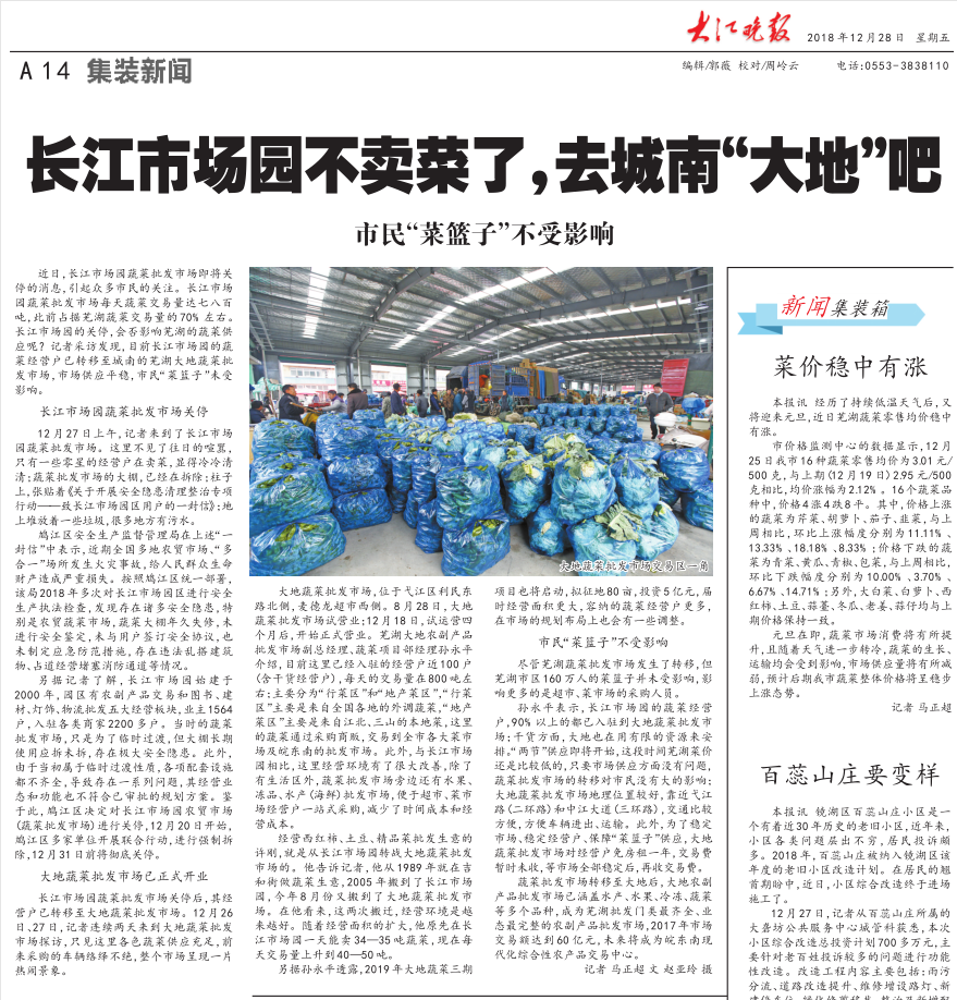開業(yè)期間,蕪湖大地批發(fā)市場還受到市民和媒體的強(qiáng)烈關(guān)注。大江晚報(bào)一篇題為《長江市場園不賣菜了 去城南“大地”吧——市民“菜籃子”不受影響》,詳細(xì)報(bào)道了蕪湖大地批發(fā)市場替代長江市場園,成為批發(fā)門類最齊全、業(yè)態(tài)最完整的農(nóng)副產(chǎn)品批發(fā)市場,未來將成為皖東南現(xiàn)代化綜合性農(nóng)產(chǎn)品交易中心。