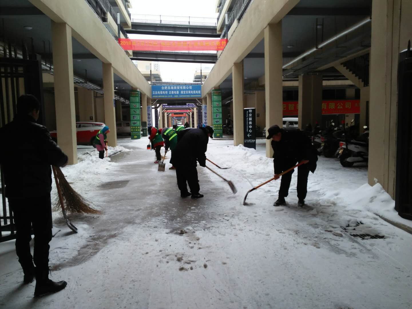 冰雪天氣來臨之前公司總經(jīng)理、總經(jīng)理助理攜同各部門負責人走訪市場,檢查消防及監(jiān)控設備運轉(zhuǎn)情況,工程部工作人員爭分奪秒檢查維護公共線路,為業(yè)主安裝三相電路,冰凍天氣來臨之前,安保消防工作人員連夜檢查各路水管線,封閉水管總閘,預防管路凍裂……除雪工作正在各個區(qū)域市場有條不紊的開展著!大家團結(jié)協(xié)作,全力清理市場的地面積雪及冰凍。
