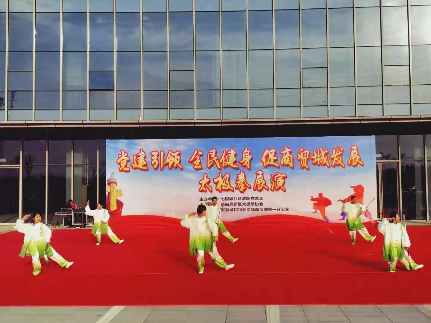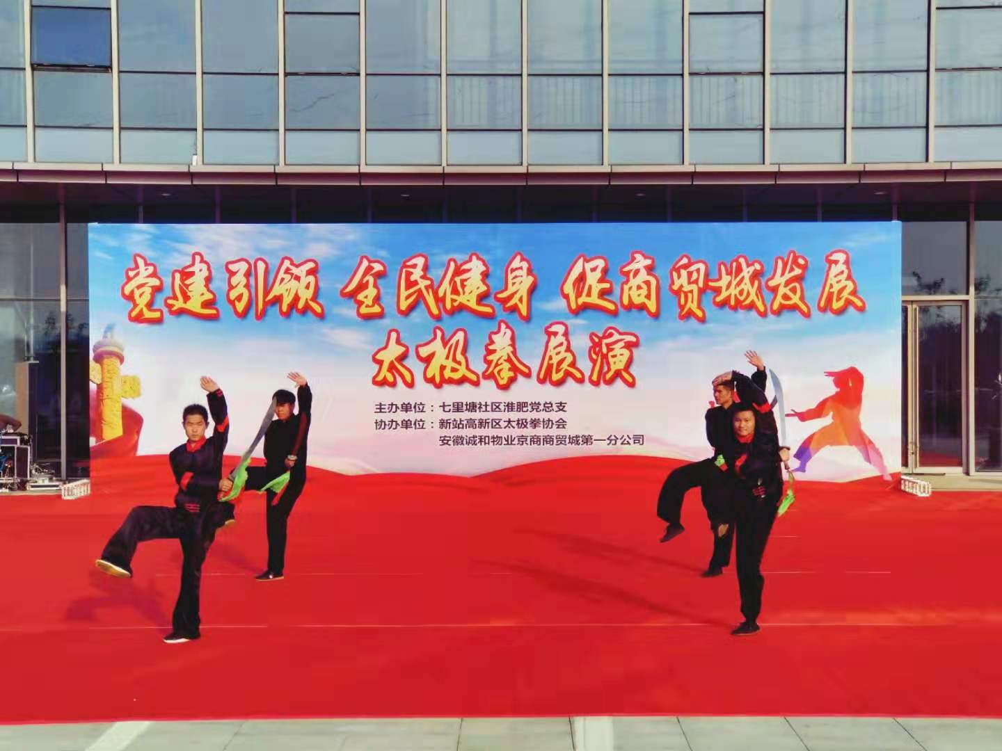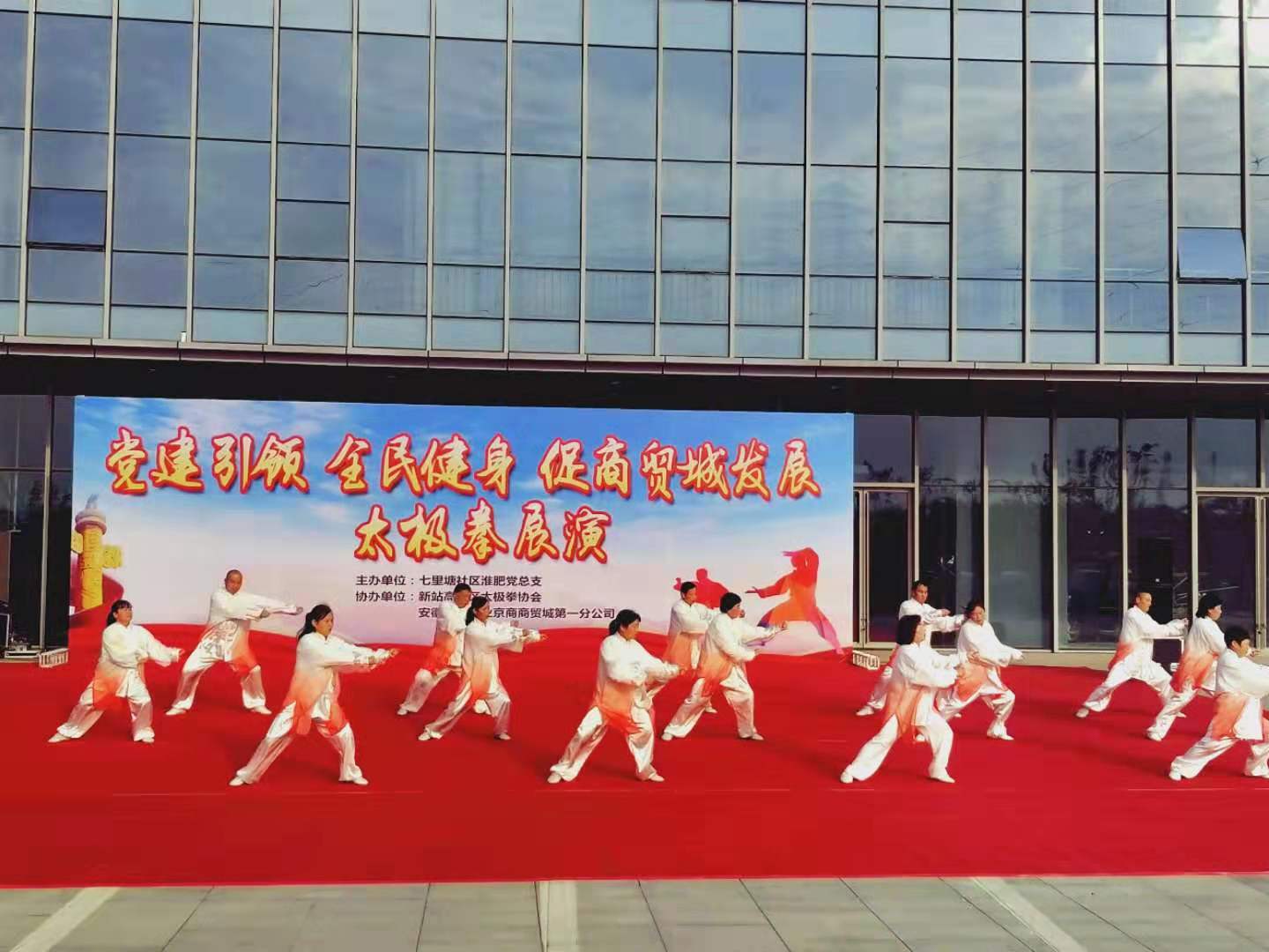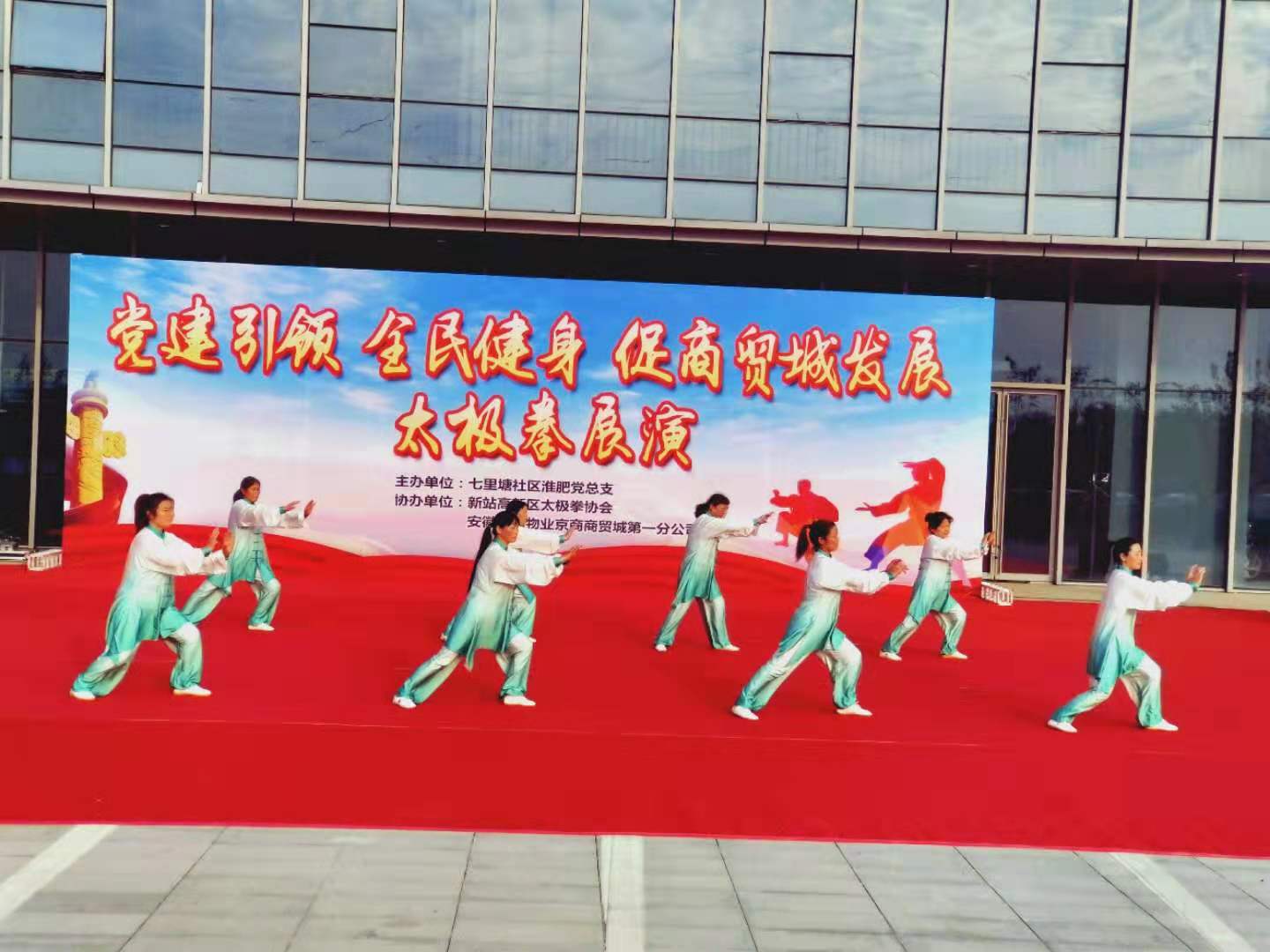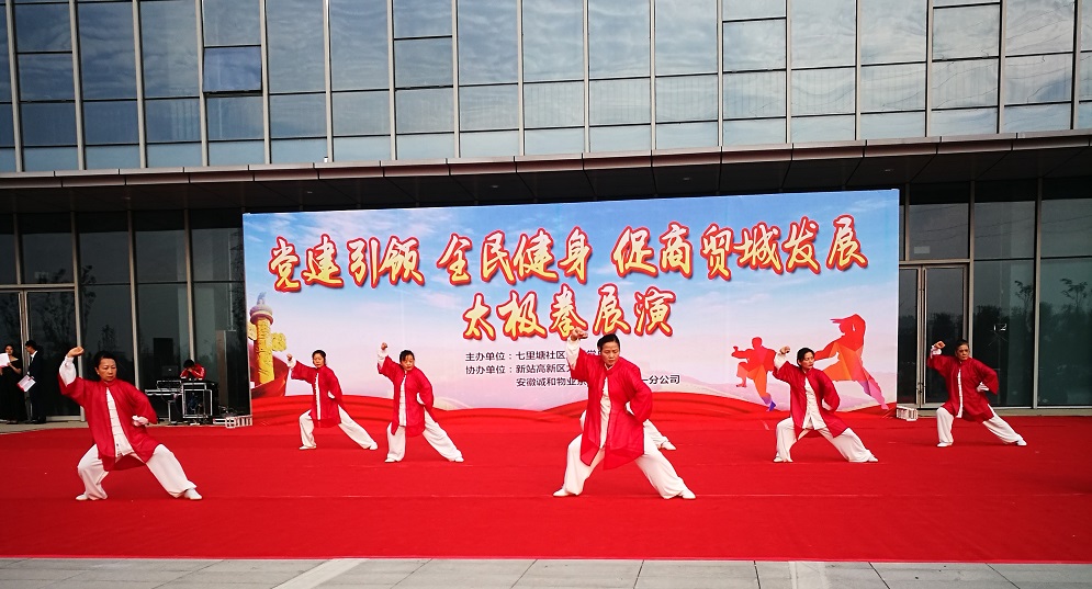 2019年10月27日,由七里塘社區(qū)淮肥黨總支主辦,新站高新區(qū)太極拳協(xié)會及安徽誠和物業(yè)京商商貿(mào)城第一分公司協(xié)辦,一場主題為“黨建引領(lǐng) 全民健身 促商貿(mào)城發(fā)展”的太極拳展演活動于下午三點(diǎn)在銅陵北路與泗水路交口金邦國際大廈南廣場拉開了序幕。
